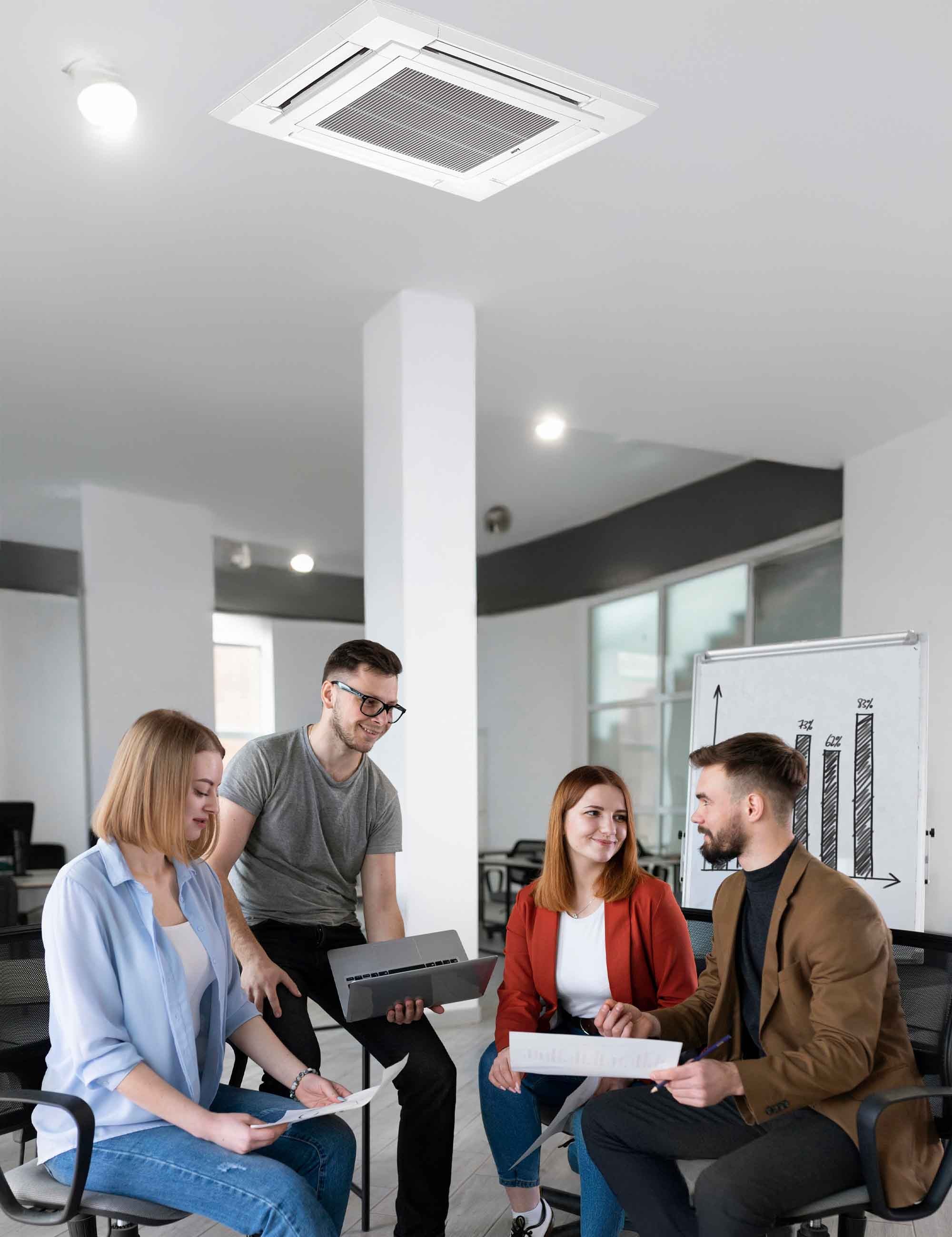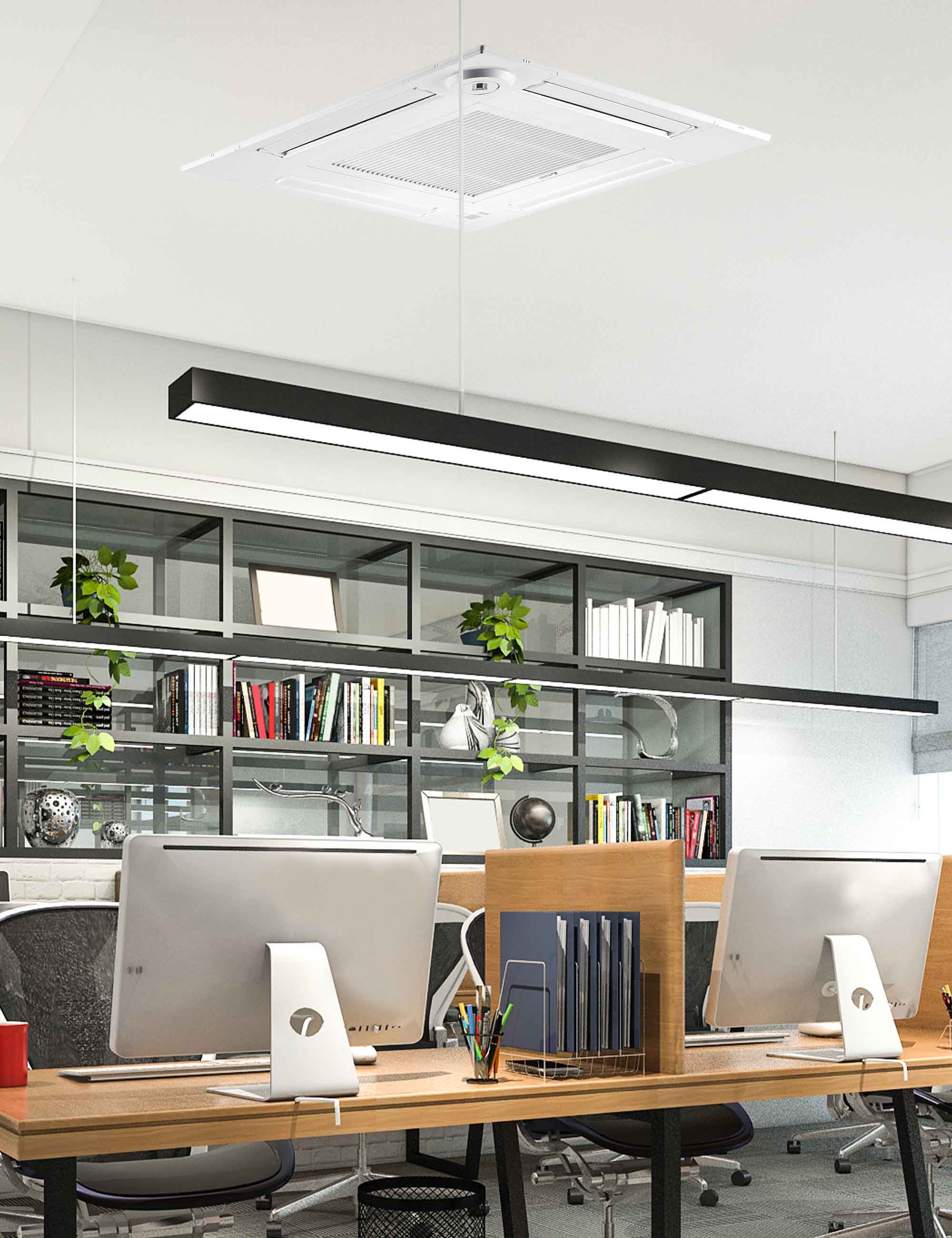 Prin combinarea reglajelor independente ale lamelelor cu fluxul amplu de aer, unitatea internă de tip casetă cu 4 direcții PLA-SM creează o distribuție termică echilibrată în întreaga încăpere. Indiferent de forma sau dimensiunea spațiului, temperatura se menține constantă, pentru un confort resimțit în fiecare colț.