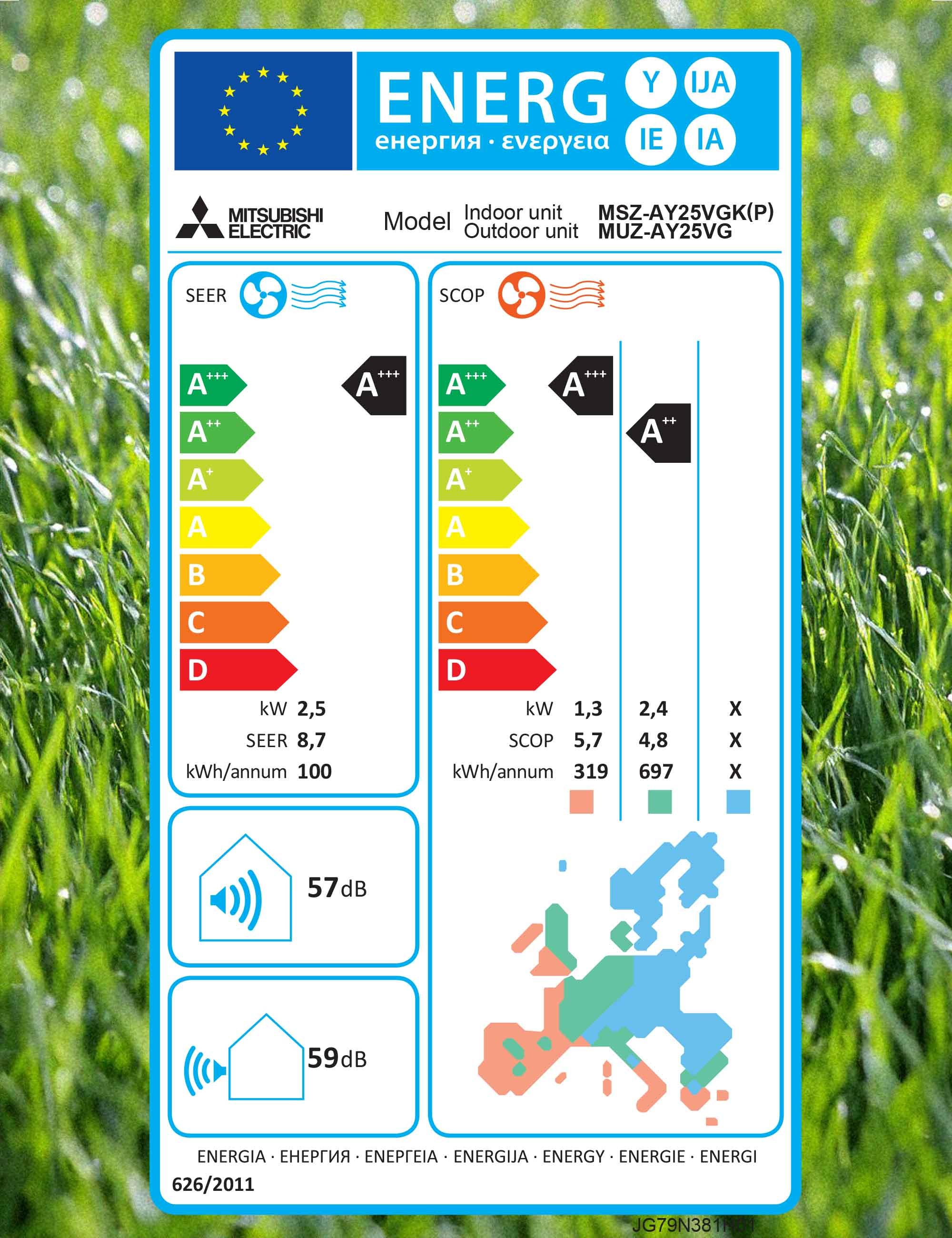 Modelele seriei Mitsubishi Electric MSZ-AY +MUZ-AY cuprinse între 9000 BTU și 12000 BTU au clasele de eficiență energetică A+++ pentru răcire și A++ pentru încălzire, în timp ce versiunea de capacitate mai mare 18000 BTU are clasa de eficiență energetică A++ atât pentru răcire, cât și pentru încălzire.